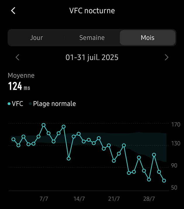 Comme pour la FCR, si tu constates que ta VFC se situe largement en dehors de l'intervalle "normal" (en particulier si elle est basse), cela peut être le signe d'une fatigue excessive, d'une maladie, d'un surentraînement ou d'une récupération insuffisante.