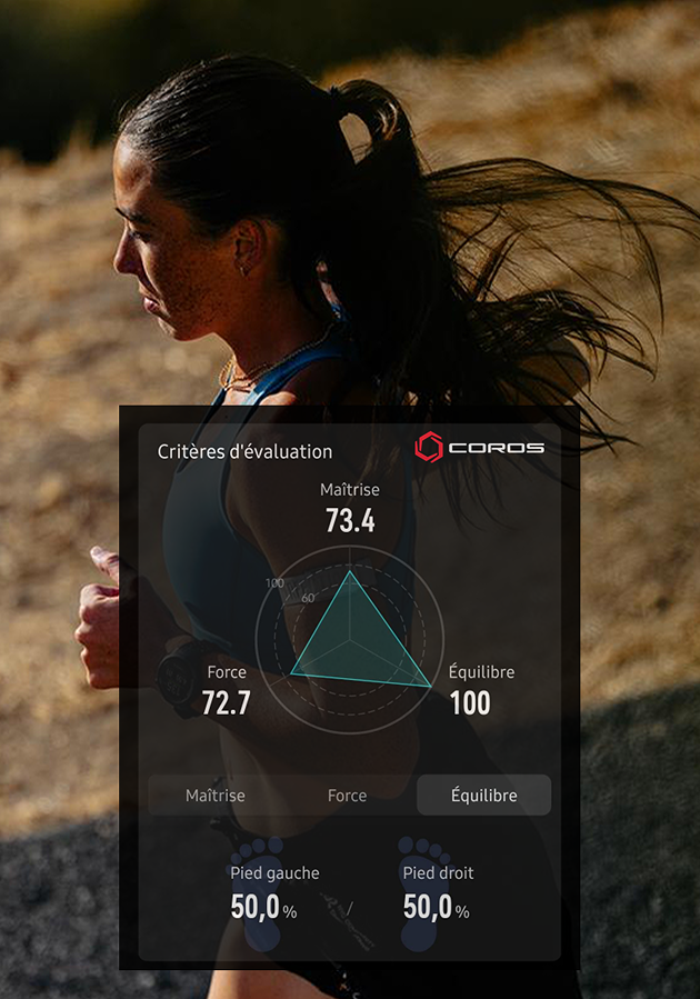Le test de forme en course à pied est intégré à chaque montre COROS. Ce test de 5 minutes, effectué avec un POD 2, peut te donner un aperçu de ta technique, de ta force et de ton équilibre. Chaque facteur est lié à la réduction du risque de blessure, et une analyse détaillée de chacun d'entre eux est disponible ici.
