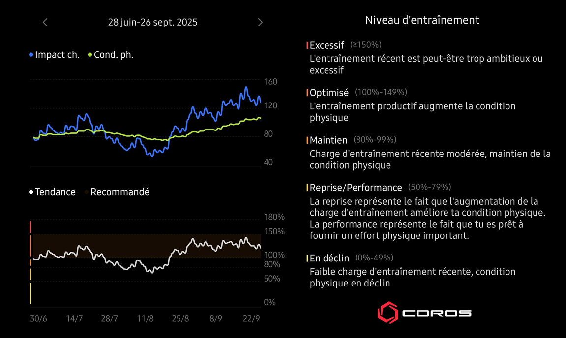 Cette mesure correspond à ta quantité d'entraînement au cours d'une période donnée (impact de la charge) par rapport à la quantité d'entraînement à laquelle tu es habitué (condition physique de base). C'est un excellent moyen de voir comment ton entraînement actuel se situe par rapport à ton entraînement habituel. Lorsque l'impact de la charge augmente trop rapidement par rapport à ta condition physique de base, le risque de blessure et d'épuisement augmente.