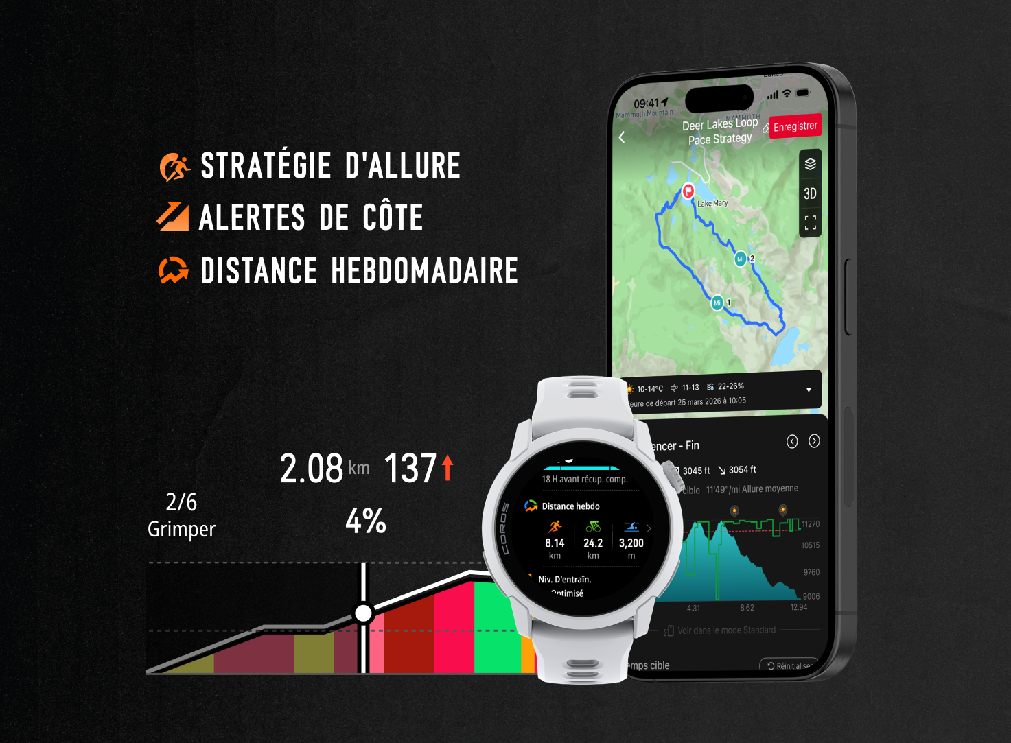 Tu peux prendre des photos pendant ton activité en utilisant l'application appareil photo de ton téléphone ou grâce à la fonction Extender de l'application COROS, qui te permet de prendre des photos directement pendant ton activité. Une fois celle-ci terminée, tu peux sélectionner toutes les images que tu as prises en dehors de l'application COROS et que tu souhaites inclure dans le résumé de ton activité (les activités prises depuis l'Extender seront automatiquement incluses). Lors de la création d'une vidéo, chaque image apparaîtra brièvement à l'endroit exact où tu l'as prise, à mesure que tu avances virtuellement sur ton itinéraire. C'est un moyen simple de marquer les moments forts de ton expérience et de transformer tes données d'activité en une histoire partageable.